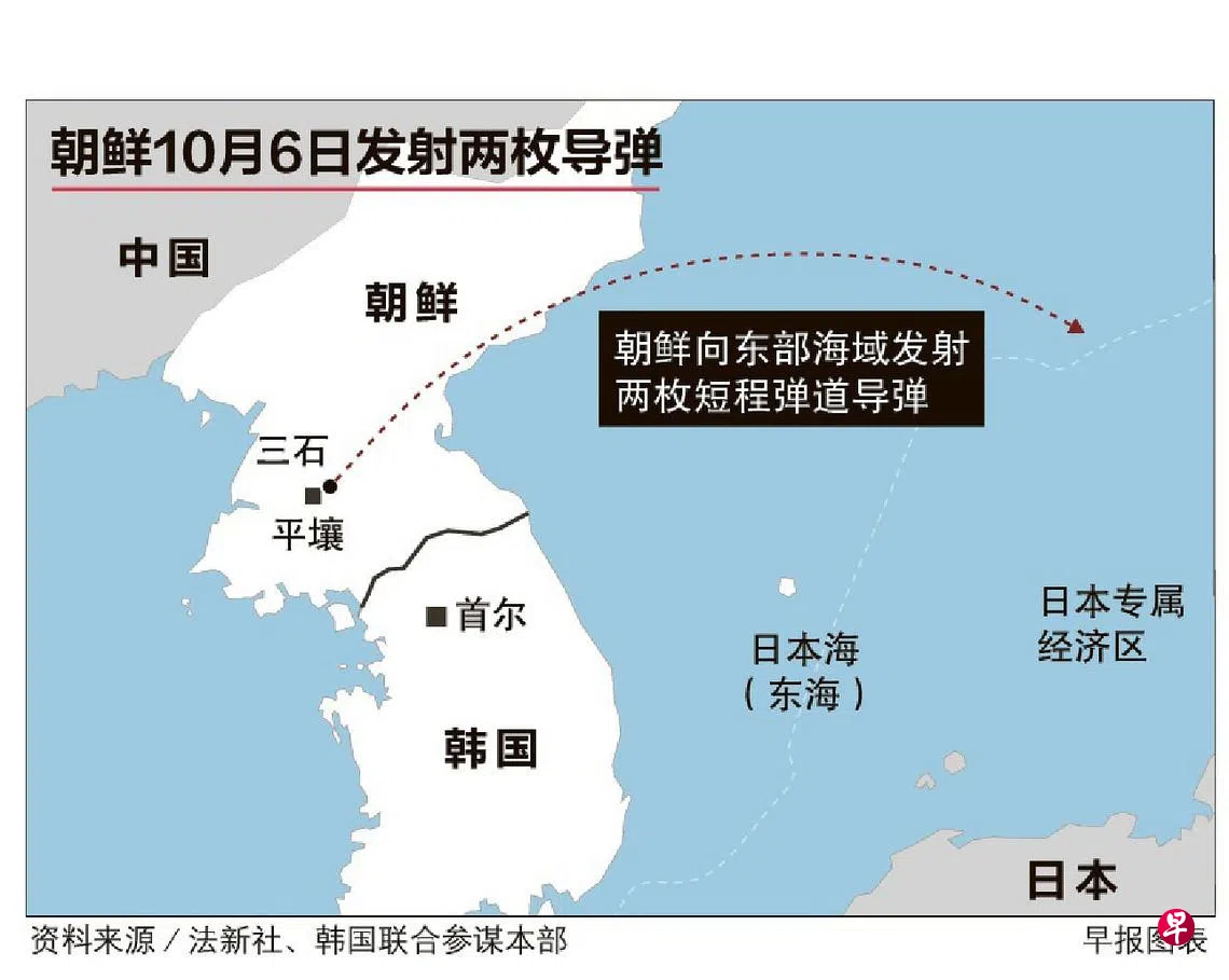 韩国联合参谋本部说,6日上午6时1分许至6时23分许,朝鲜从平壤三石一带向东部海域发射两枚短程弹道导弹。首枚导弹射程为350多公里,射高为80多公里,飞行速度约为五马赫;第二枚导弹射程为800多公里,射高为60多公里,速度约六马赫。