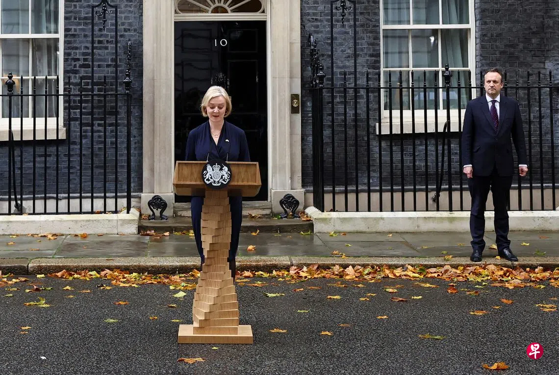 伦敦时间星期四(10月20日)下午1时30分(新加坡当晚8时30分),特拉斯在首相府外发表简短声明,宣布她已向国王查尔斯三世递交辞呈。