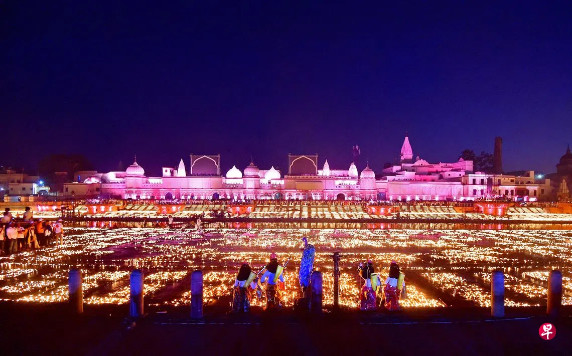 阿约提亚是印度七大圣城之一,位于首都新德里以东555公里,传说是印度教神祇罗摩的出生地。2017年,当地灯节展示了17万1000盏油灯,之后数量逐年增加,去年为94万1000盏。