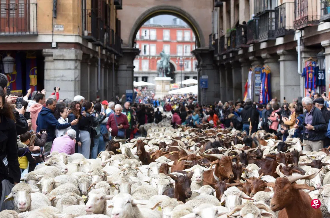 10月23日,西班牙首都马德里市中心有数千只绵羊和山羊穿过闹市,与市民欢庆一年一度的移牧节(Transhumance Festival)。在西班牙,每当季节由夏至冬逐渐转换时,牧人会赶着成千上万的羊、牛和其他牲畜,从凉爽的高原牧场向地势较低的草地迁移,形成数条传统游牧路线。1994年,牧民在马德里发起移牧活动,以说服国会通过《牧羊人道路法》,承认游牧路径是独一无二的文化遗产。近期能源价格不断上涨和通货膨胀加剧,饲料成本一路走高,对西班牙畜牧业造成严重影响。牧民希望借这一节日,让传统畜牧业得到更多关注。(新华社)