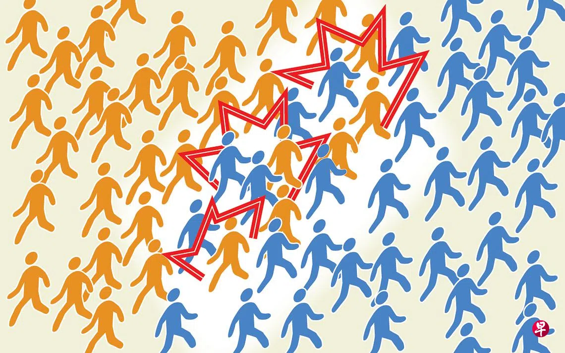 不同方向的人流交汇,特别是朝相反方向对冲时,就有很大概率发生踩踏事故。尤其在场所相对狭窄的空间,踩踏的概率就更大。