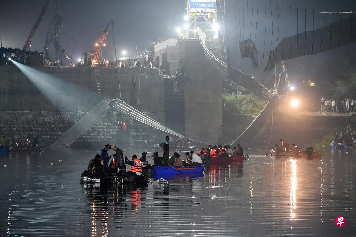 印度西部古吉拉特邦(Gujarat)一座拉索桥星期天(10月30日)下午6时20分左右(新加坡时间晚上9时20分)突然从中间断裂,导致桥上数百人瞬间掉入10米深的河中,包括约35名儿童遇难,而一个家庭则在一夕之间痛失七名家庭成员。
