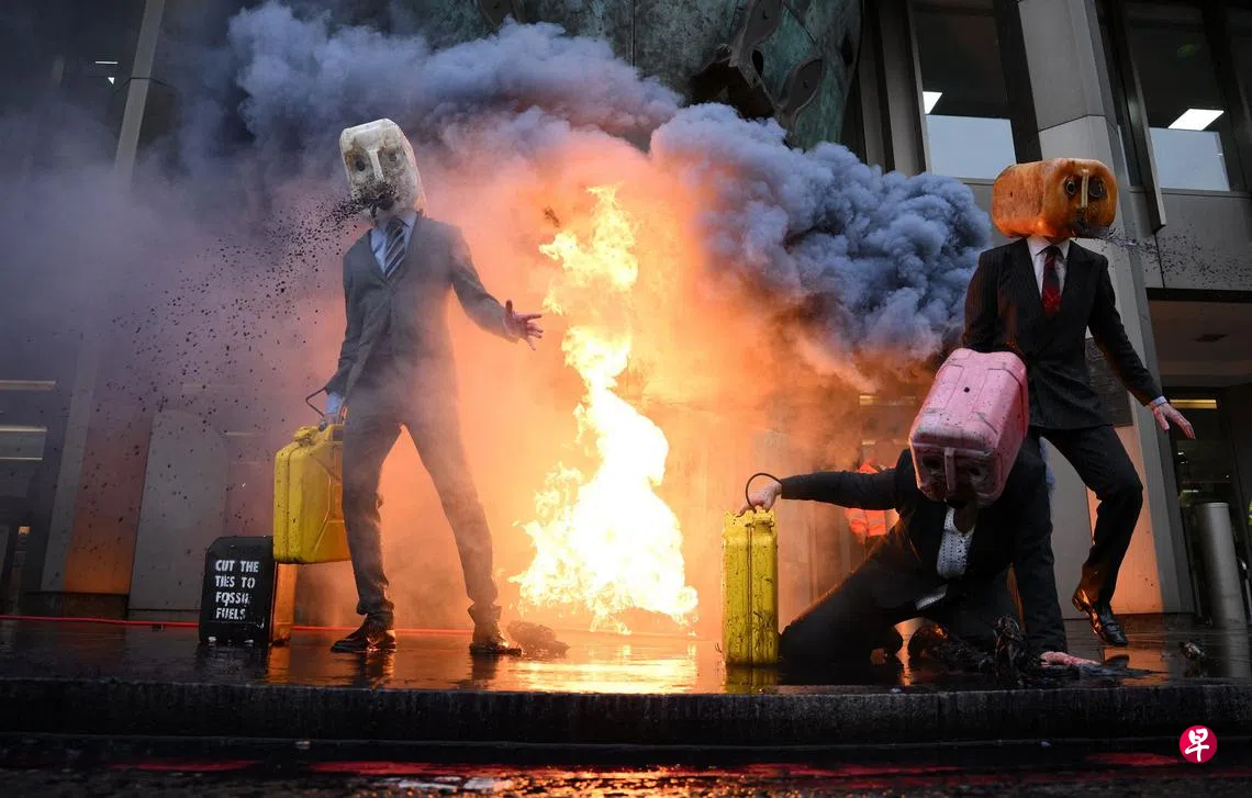 多个环保团体星期一(11月21日)在英国伦敦市中心的多个地点举行停止使用化石燃料示威活动,他们的目标为与化石燃料行业有关系的公司和组织的办公室。图为“海洋反抗”组织成员在国际海事组织的办公室外头戴油桶,假装呕吐出石油。刚落幕的第27届联合国气候大会,因有许多石油和天然气公司的代表出席而受到批评。大会最终未能通过具有雄心的减排协议,令许多与会者感到不满。