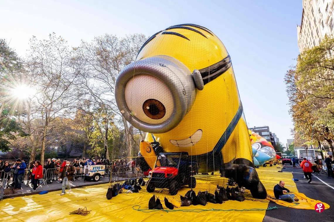 第96届梅西感恩节大游行星期四(11月24日)在美国纽约市举行,图为工作人员在游行前夕,为参与游行的动画电影《小小兵》(Minions)造型气球充气。梅西感恩节大游行是由梅西百货公司(Macy's)主办的年度游行,始于1924年。今年的大游行共展示16个巨型气球和28辆花车,游行队伍有数千人,还有众多明星表演助阵。这场游行预计吸引约300万人到场观看,另外估计有数千万人通过电视台和串流平台收看直播。