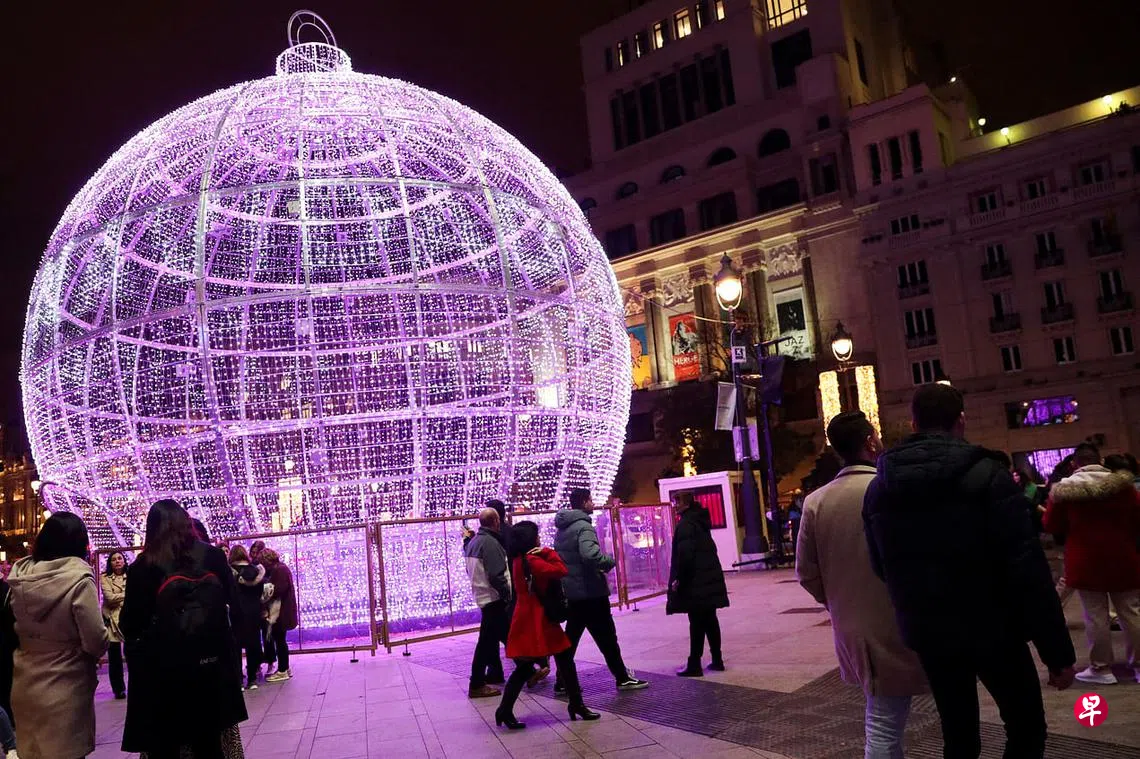 西班牙各地洋溢着浓郁的圣诞气氛。首都马德里的市长阿尔梅达在11月24日晚上7时30分(新加坡25日凌晨2时),正式启动230多个地点的圣诞灯饰。尽管西班牙面临能源价格飙升以及通货膨胀率高达7.3%等危机,但随处可见的圣诞灯饰无不反应出当地居民对圣诞佳节的期待。图为人群驻足欣赏马德里一处设计独特的圣诞灯饰。