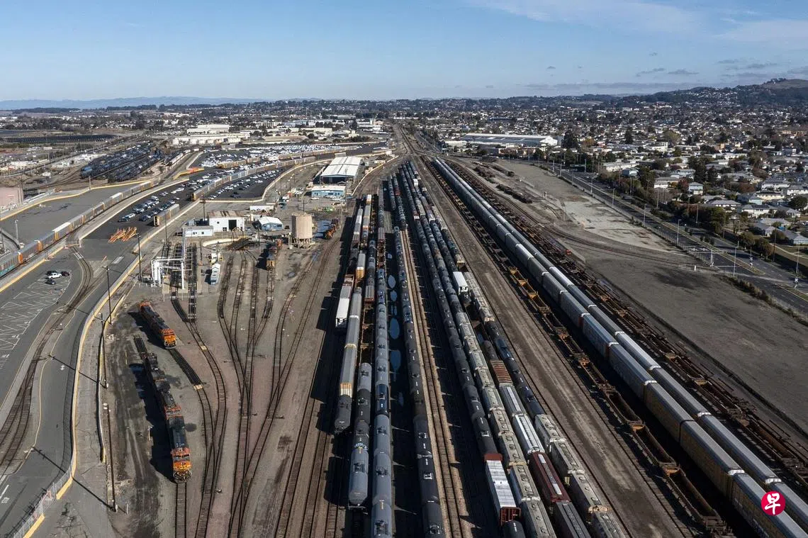 图为美国加利福尼亚州里士满的货柜列车总站。(彭博社)