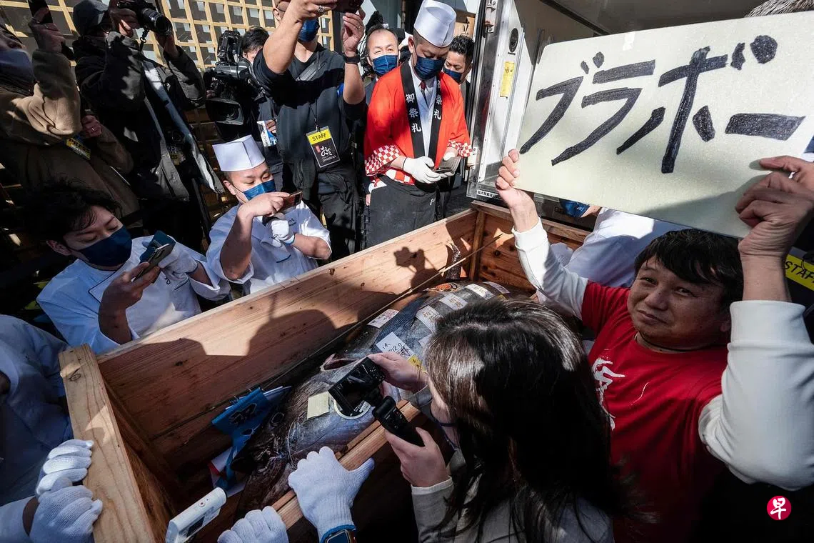 贵鱼指的是,在东京最大的丰州市场开年举办的第一场金枪鱼拍卖会上,一尾来自青森县大间港的212公斤蓝鳍金枪鱼,最终以3604万日元(约36万新元)成交。这个价格是去年最高拍卖价的2.1倍,创下了冠病疫情暴发以来的最高价。