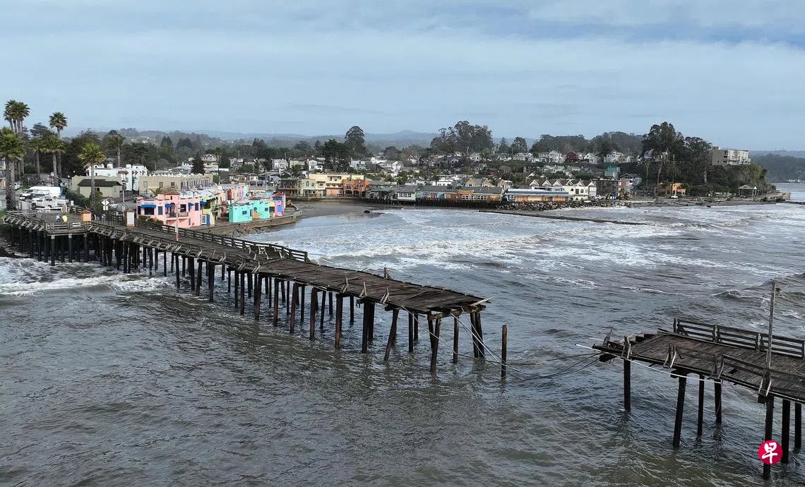 美国加利福尼亚州遭遇暴风雨袭击两天,导致数万户家庭断电。加州北部的电力人员1月6日忙着为约6万用户恢复电供。这张当天拍摄的照片显示,加州卡皮托拉码头登船处已在狂风暴雨中被毁。