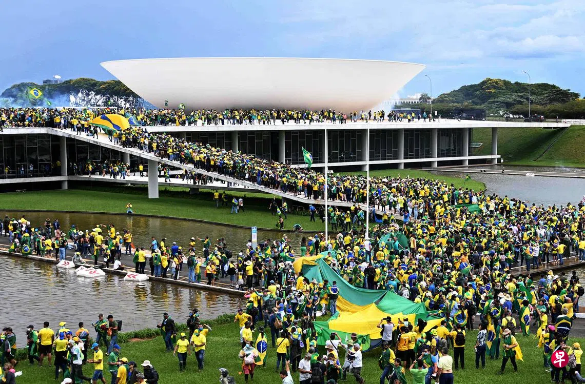 1月1日上任的巴西总统卢拉将事件归咎于博索纳罗,并誓言将严惩所有闹事者。一直拒绝承认败选的博索纳罗则在事发近六个小时后,才在推特发文谴责示威者“掠夺和入侵公共建筑的行径”。但他驳斥卢拉对他的指控“毫无根据”,并表明民众有权举行“和平示威”。(法新社)