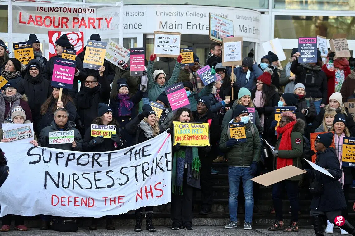 英国护士星期三(1月18日)又展开两天罢工,争取更高工资以应付仍在飙升的通货膨胀,已在承受重压的国营医疗服务料会面对更大的冲击。护士们高举的横幅写着:“支持护士罢工、维护国家医疗服务体系”。上个月,英国护士也在一个多世纪以来首次停工,加入其他部门公务员的罢工浪潮。主要的护理工会指责政府未能就改善本年度的薪酬协议认真地谈判。18日公布的最新年度通胀数据显示,通胀率仍接近历史高峰,12月通胀率小幅回落至10.5%;1月份为10.7%。(路透社)