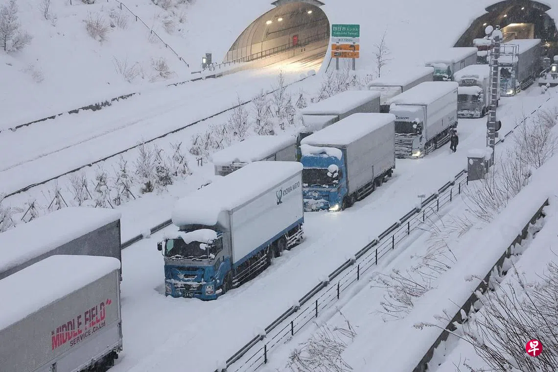 本州南边的三重县北部地区,星期三上午7时发出大雪预警,但经过该县的新名神高速公路部分路段在那之前就已积雪,有数十辆大型货车天没亮就上路,结果都在高速公路上被积雪困住。由于积雪厚、面积大,除雪车无法开到现场,数十名货车司机在冰天雪地里动弹不得。