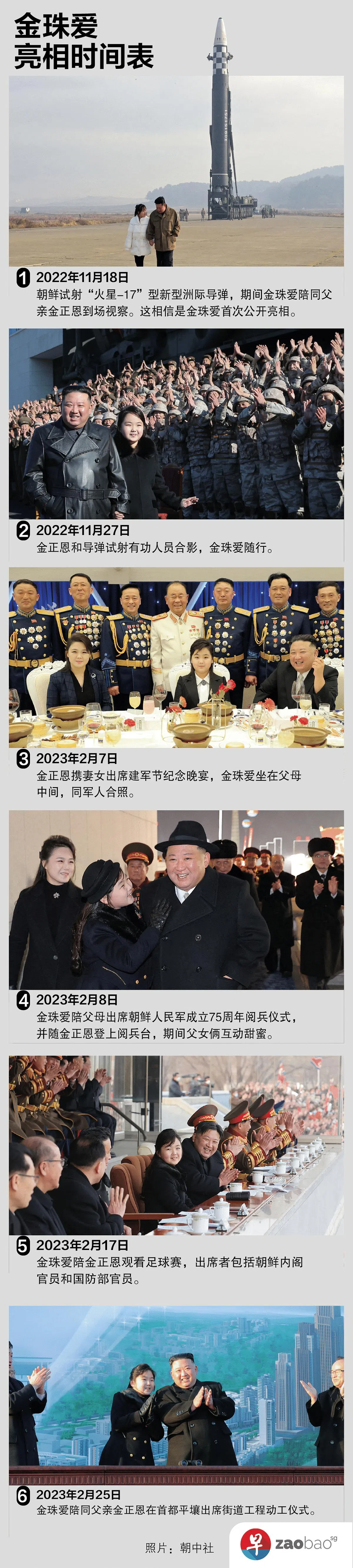 近三个月以来,金珠爱共六次在公开场合中现身,其中四次都是有关展示武器或军威的场合。此外,朝鲜2月还发行了“金珠爱邮票”,记录了她在2022年11月,陪同父亲视察朝鲜试射弹道导弹的“温馨情景”。