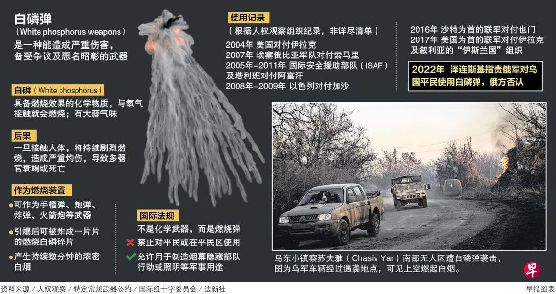 此前,乌克兰总统泽连斯基控诉俄军使用白磷弹。法新社驻前线记者报道,两枚白磷弹相隔五分钟落在察苏夫雅南部边缘的一条公路上,这条公路通往附近的前线巴赫穆特(Bakhmut)。巴赫穆特是俄罗斯入侵乌克兰一年以来,时间最长且最血腥战役的地点。