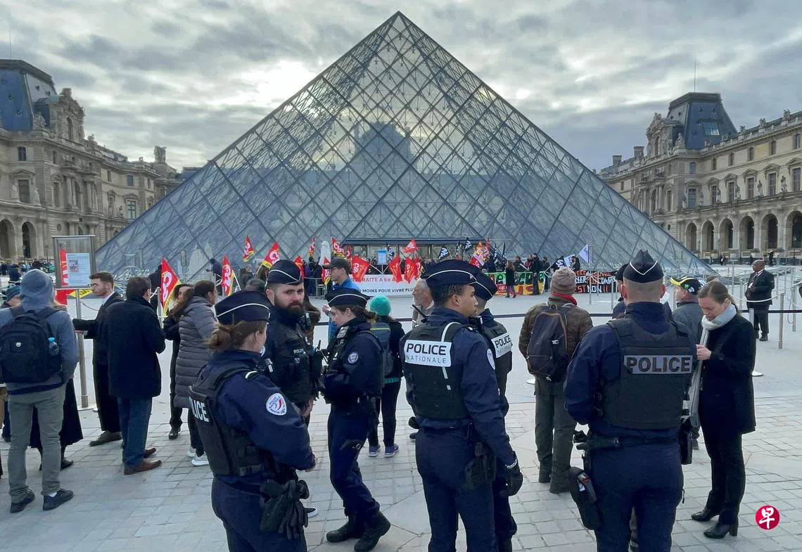法国各大工会星期二(3月28日)在全国各地举行新一轮全国大罢工和示威,抗议总统马克龙倡导的养老金制度改革法案,一些示威者在罢工前夕封堵巴黎罗浮宫入口,让许多慕名而来的游客大失所望。图为罗浮宫博物馆员工在馆外挥舞工会旗帜抗议法案将退休年龄上调至64岁。(路透社)
