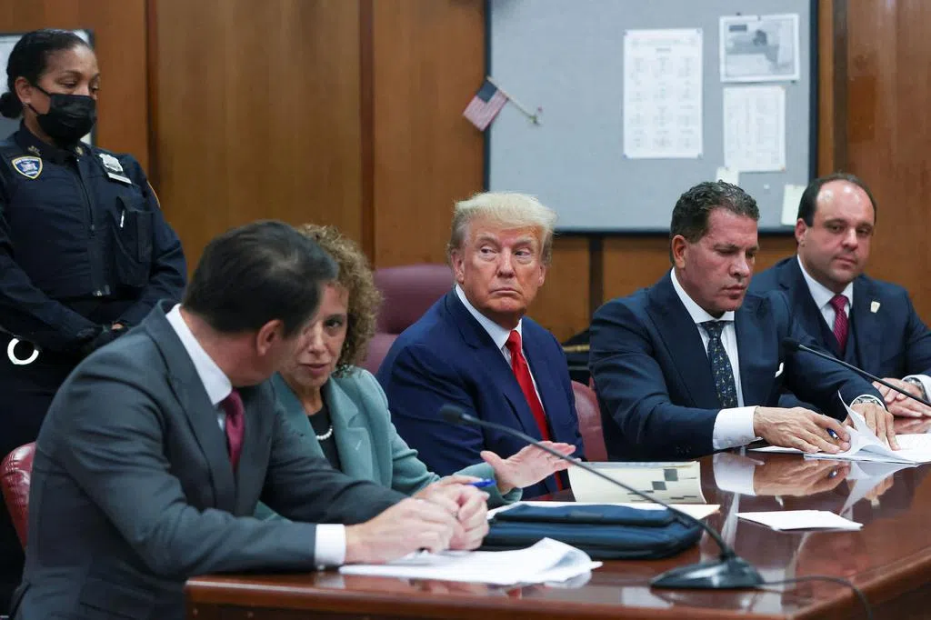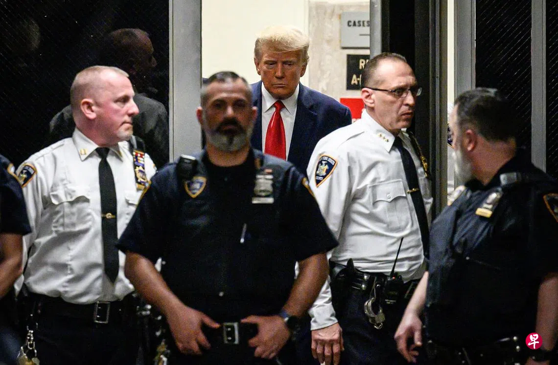 76岁的特朗普星期二(4月4日)下午抵达纽约曼哈顿刑事法院,在登记相关信息后被带往法庭,他并未戴手铐。