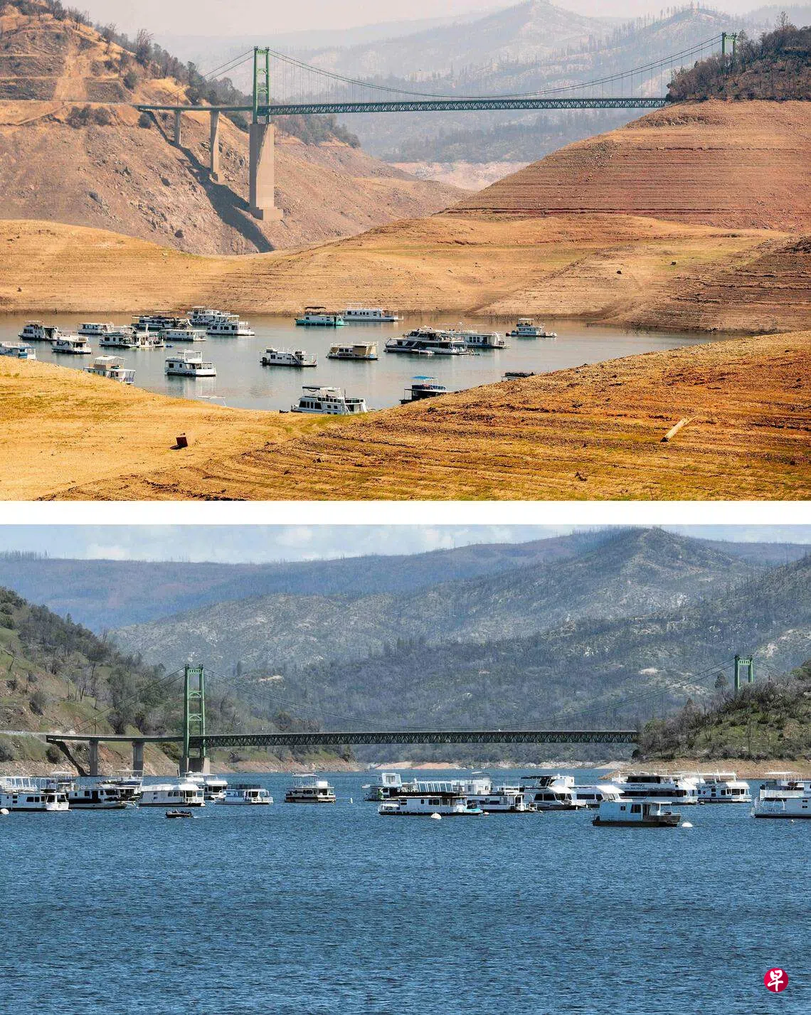 美国加利福尼亚州冬季近创纪录的降雨量,不但让持续多年的旱情大大减缓,许多干涸的河流和小溪更是焕发了生机。充沛的雨水让比德韦尔·巴尔桥附近的奥罗维尔湖(Lake Oroville)回复原貌。2021年9月5日(上图)与2023年4月16日(下图)的照片由同一个角度拍摄,色调却截然不同、人口4000万的加州常年受旱灾、林火等威胁,河流、湖泊和水库的水位节节下降,直至2022年冬天的降雨后,旱地才再现生机,连80年前干涸的中央山谷图莱里湖(Lake Tulare)也重现。干旱监测机构上周发布的官方统计数据显示,一年前全境干旱的加州约三分之二的地区已完全摆脱干旱。