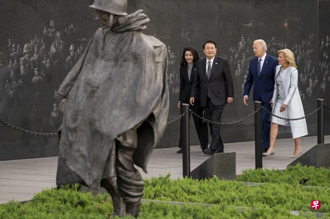 尹锡悦星期二在美国副总统哈里斯陪同下,到访美国国家航空航天局(NASA)戈达德太空研究所。他过后和拜登一同前往华盛顿的韩战纪念碑献花圈。