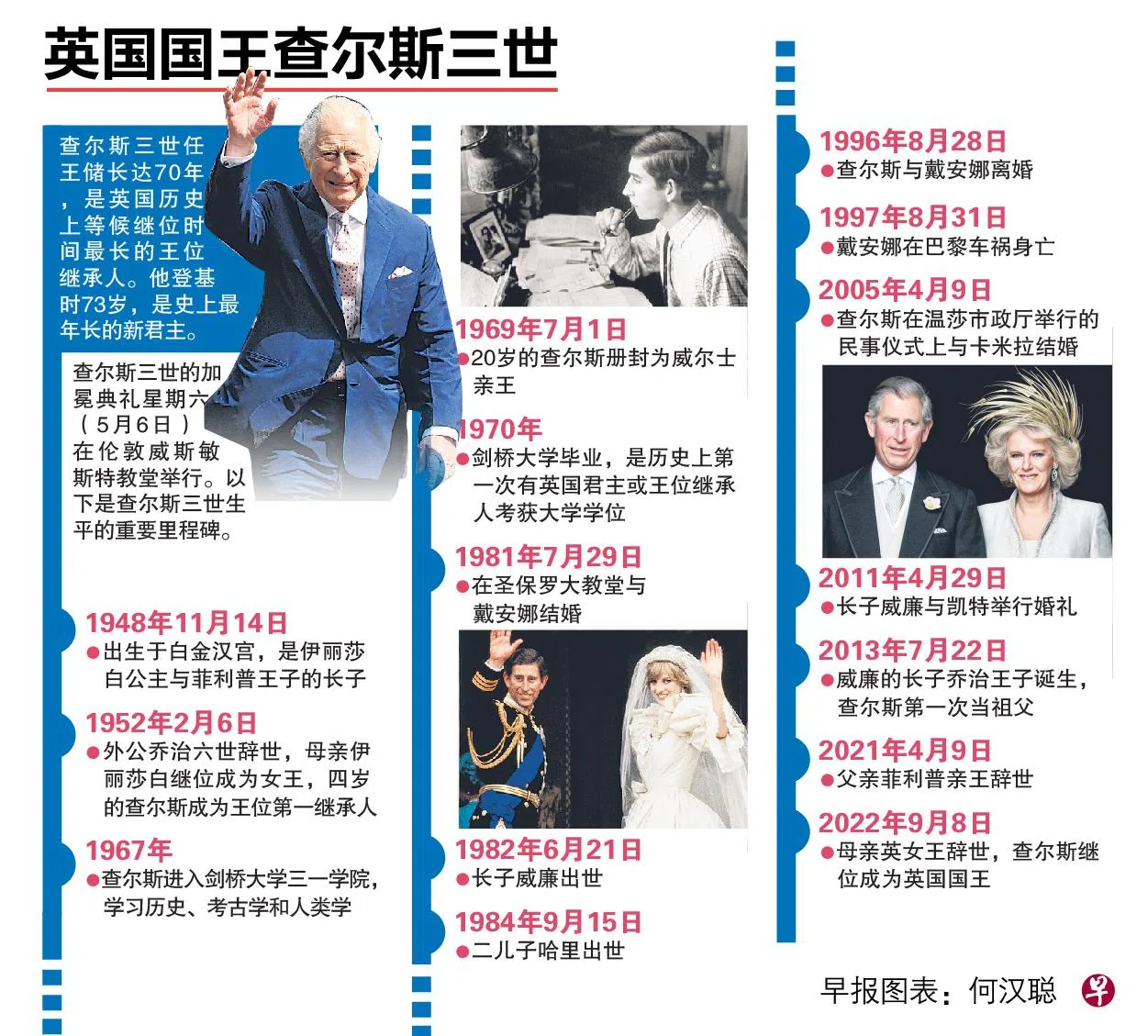 (伦敦综合电)英国王室时隔70年首办的加冕典礼,星期六(5月6日)在伦敦威斯敏斯特教堂举行,现年74岁的英国国王查尔斯三世成为史上最年长的新君主。
