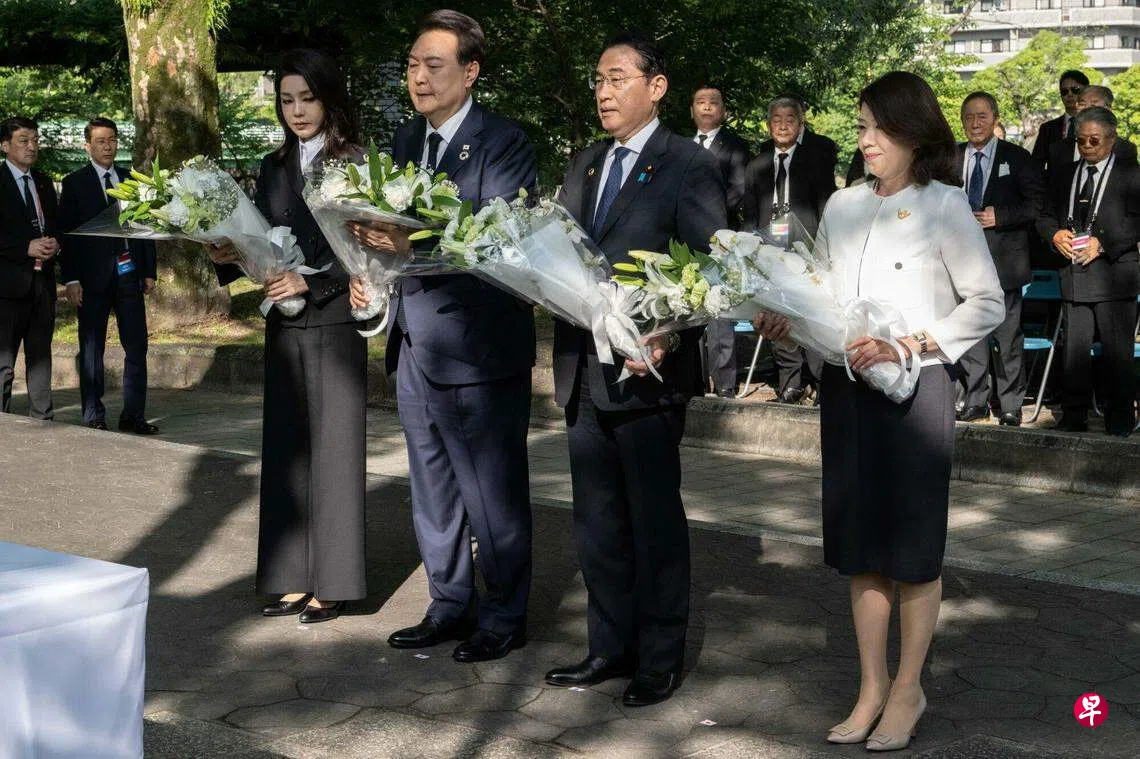 (广岛综合电)韩国总统尹锡悦和日本首相岸田文雄一起到广岛原爆纪念碑前,向韩国遇难者献花。这是日韩领导人首次一道走访纪念碑,凸显日韩关系在七国集团(G7)峰会上进一步回暖。