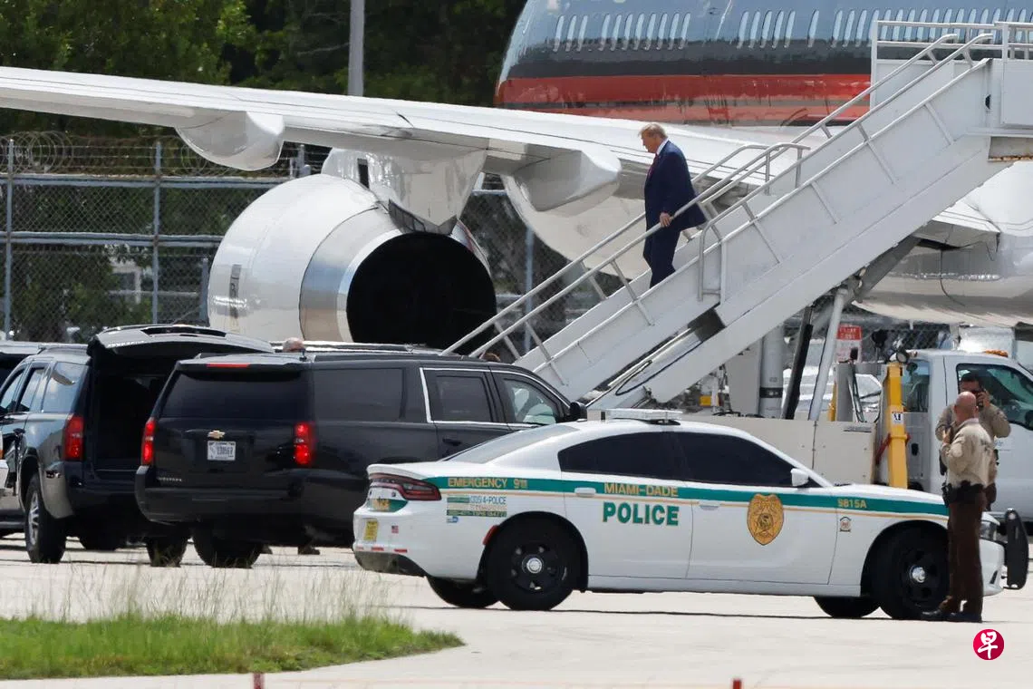 特朗普星期一(12日)从新泽西州乘私人飞机抵达迈阿密,准备星期二下午3时(新加坡时间星期三凌晨3时)出庭。他被指在2021年卸任后,非法把政府机密文件带到他在佛罗里达州的别墅,之后还拒绝归还这些文件和阻扰调查人员的工作。