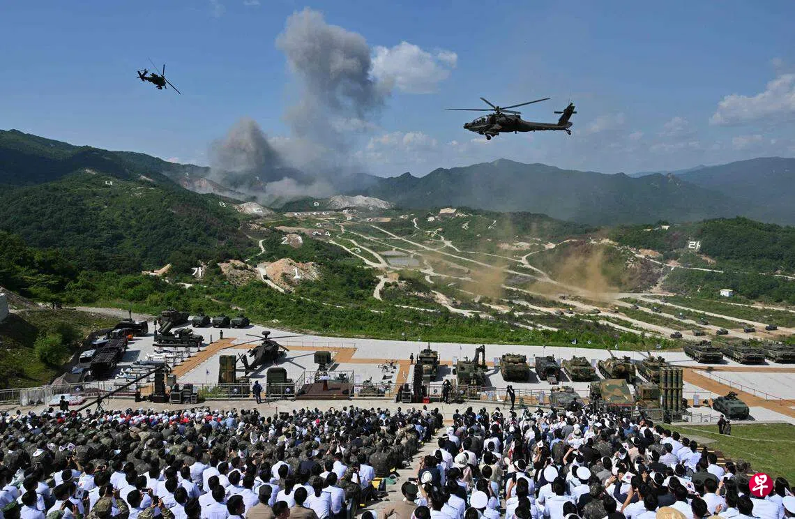 韩国总统尹锡悦等人到场观看了联合军演。共有2500名韩国士兵参加演习,出动了韩军尖锐武器配备,包括韩国F-35战斗机与K9自主榴弹炮,和美国F-16战斗机与无人机。