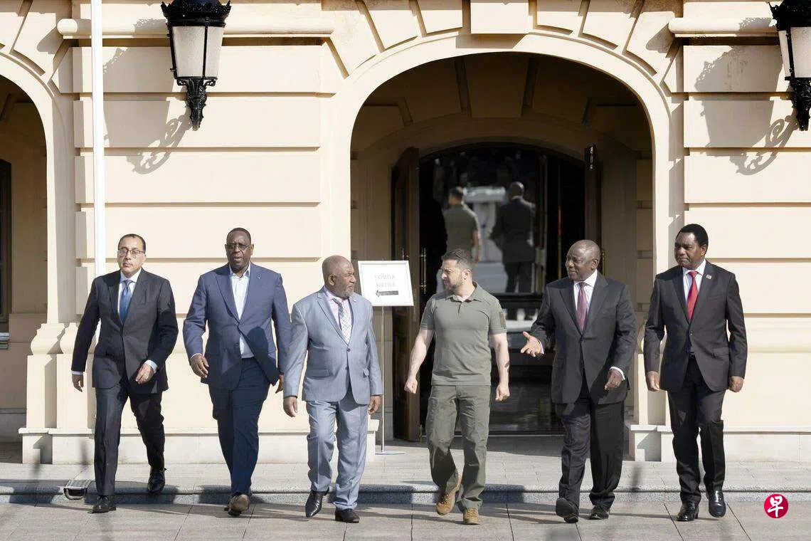 非洲代表团由南非、塞内加尔、埃及、赞比亚和科摩罗五国的领导人和高官组成。他们到基辅劝和,并表达对这场战争对非洲大陆造成影响的担忧,尤其是谷粮供应受干扰,价格持续上升。