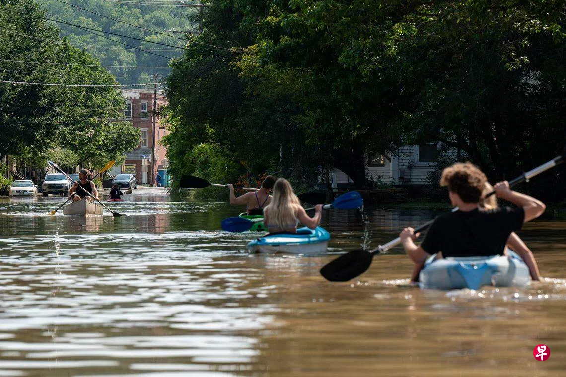 美国佛蒙特州首府蒙彼利埃市中心一些民众星期二(7月11日)被迫划船经过洪水淹没地区。 (法新社)
