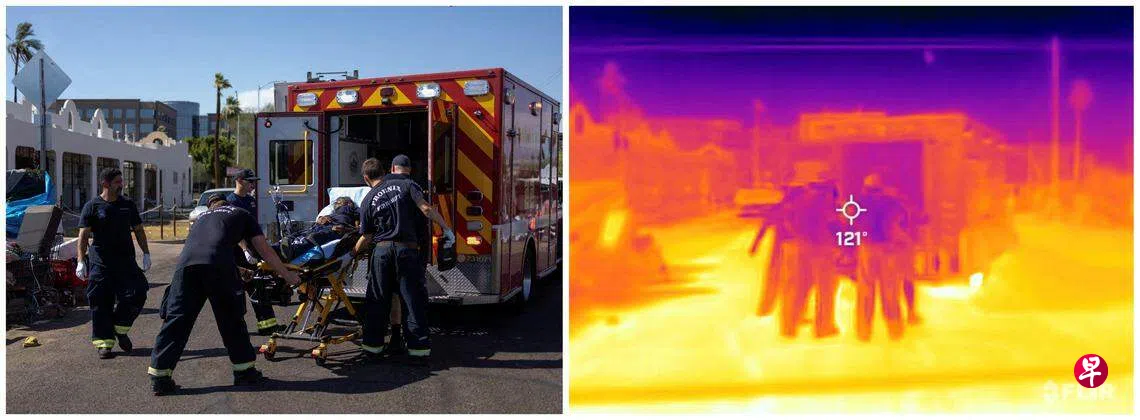 左图为7月26日,菲尼克斯一名男子在高温炙烤下昏倒,被消防员抬上担架,送到医院治疗。右边的热像仪影像显示,当天下午菲尼克斯表面温度高达49摄氏度,远高于空气温度36摄氏度;颜色越浅代表温度越高。