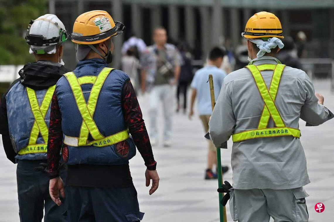 东京车站外的工人们(左)穿着内置风扇的无袖外套来抵御酷暑。 (法新社)