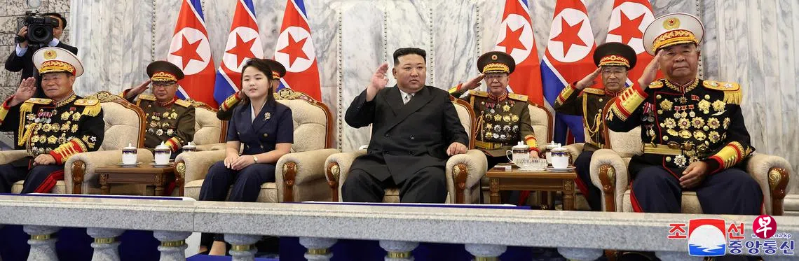 阅兵式上,金正恩牵着女儿金珠爱入场,一同坐在主席台中央。在重要的政治活动中,金珠爱坐在父亲旁边尚属首次。