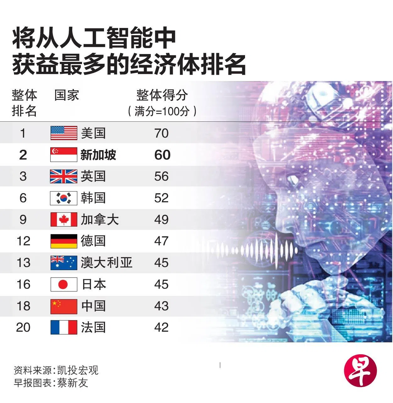 总部位于伦敦的经济研究机构凯投宏观(Capital Economics)对各国从AI受益的潜力进行了排名,结果显示,美国位居榜首,接下来依次是新加坡、英国和瑞士。