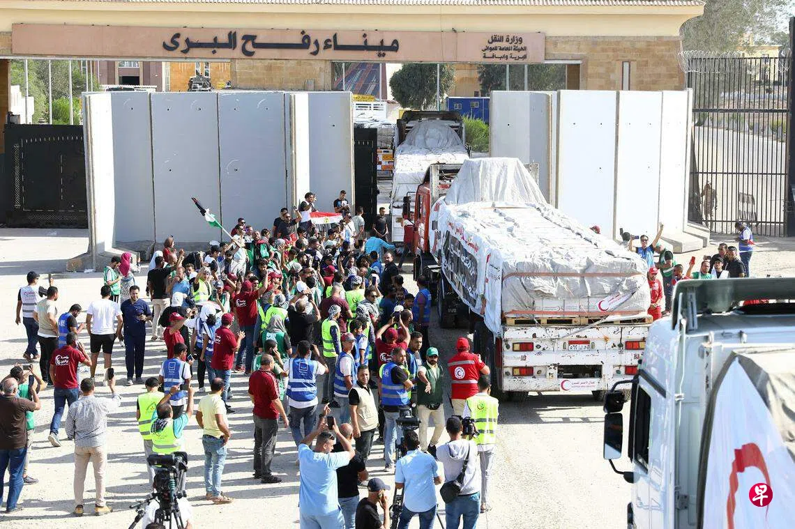 载有粮食与医用品等援助物资的20部卡车于当地时间星期六上午,从拉法(Rafah)口岸埃及一侧进入加沙地带。埃及电视台当天播放了卡车从过境点驶入加沙的画面。这是以哈冲突爆发两个多星期以来,首批进入加沙的援助物资。