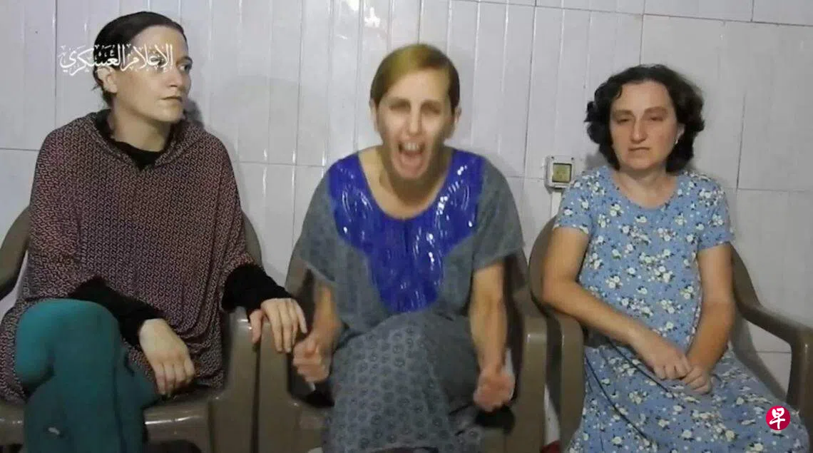 根据哈马斯星期一(10月30日)发布的视频,三名被挟持的以色列女人质神情紧绷地并排坐在椅子上,她们分别是特鲁帕诺布(Yelena Trupanob)、阿洛尼(Danielle Aloni)和基尔什特(Rimon Kirsht)。