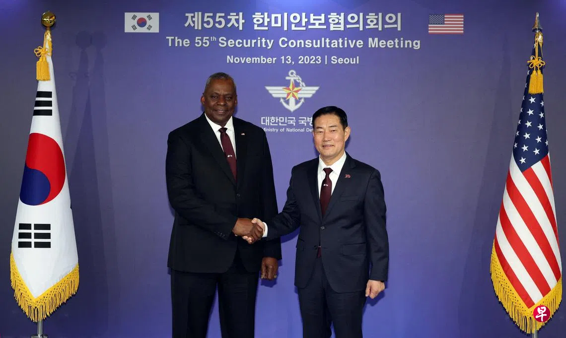韩国国防部长申源湜和美国国防部长奥斯汀星期一(11月13日)在首尔龙山国防部大楼召开第55次韩美安保会议,并发表包括18项内容的联合声明。其中一项就是全面修改《定制型威慑战略》(Tailored Deterrence Strategy)。
