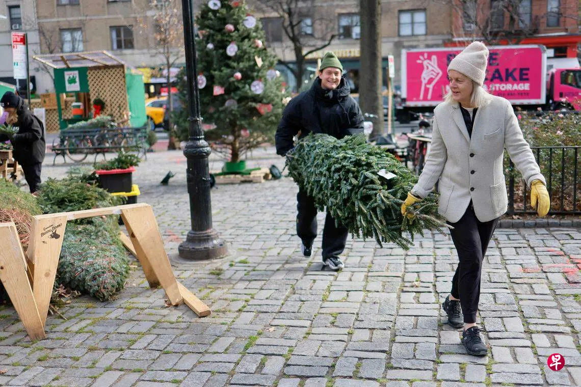圣诞节临近,美国家庭陆续开始购置圣诞树等节日装饰。当地时间星期四(12月14日),纽约市民提着刚刚购买的圣诞树回家。美国的圣诞节日用品都在涨价,圣诞树也在其列。2008年金融危机期间,美国各地的圣诞树农场纷纷关闭,导致圣诞树短缺,价格也随之上涨。圣诞树通常需要10年才能长成,因此近几年来,这股后劲已对圣诞树种植行业产生影响。如今更多消费者考虑购买人造圣诞树,但预计这一替代产品也难免涨价。(法新社)