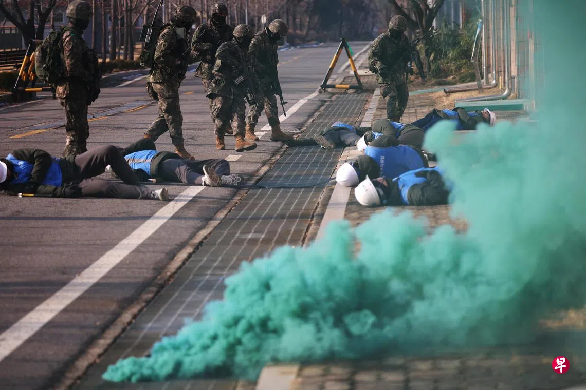 演习设想,朝鲜对韩国主要供水系统、电话网络站、地下通讯和电力电缆走廊发动攻击,1000多名韩国军人、警察和应急人员模拟了相关应对措施。图中的参与者假装受伤倒地,武装军人到场应对。