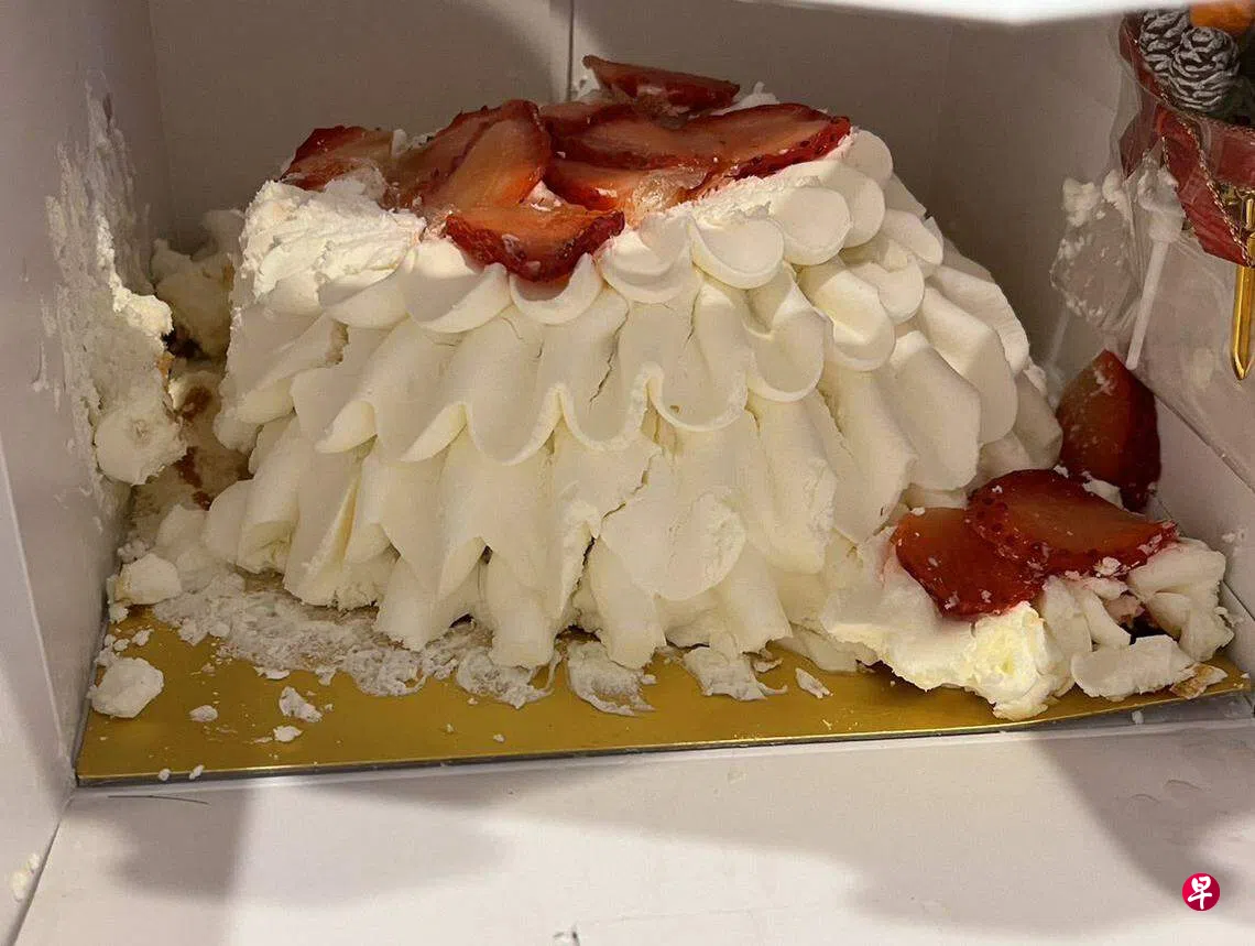 一名女子在社交媒体上载一张已坍塌的蛋糕照片,贴文写道:“我两个月前就订了这个人气蛋糕,准备平安夜晚上和家人一起庆祝圣诞。蛋糕送来时,我直接将它放在冰箱里,没去检查里面的情况。谁知,隔天打开来看,蛋糕坍塌在盒子里,融成一堆奶油泥。”