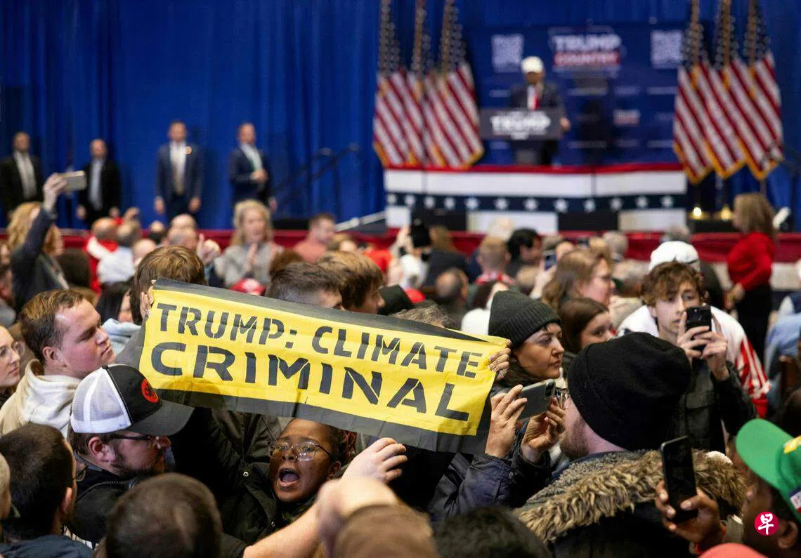 集会发生插曲,几名抗议气候变化的示威者手持标语牌,高喊特朗普是“气候罪犯”,被警卫赶出会场。特朗普支持群众则高喊“美国,美国!”回应,特朗普看着示威者被赶走,嘲讽他们“年轻、幼稚”。