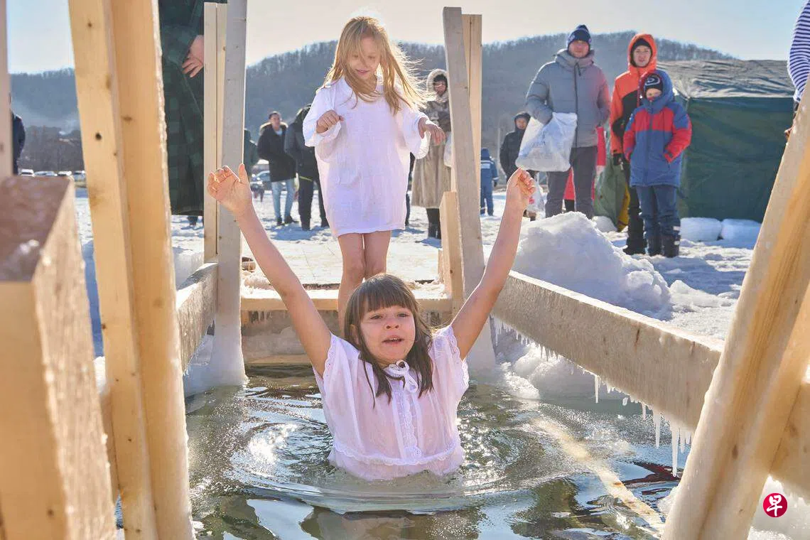 1月19日是俄罗斯东正教的重要节日主显节(Epiphany)。在俄罗斯符拉迪沃斯托克,一群衣着单薄的女孩冒着严寒,在冰冷的水中浸洗。据俄媒报道,每年到了主显节,俄罗斯各地的东正教徒都会泡在寒冷的河流、池塘和湖泊中,以纪念耶稣在约旦河受洗。根据传统,人们会将自己完全浸入水中三次,象征神圣的三位一体。克里姆林宫说,总统普京当天也顶着零下低温,从一个冰窟窿进入冷水中。(新华社)