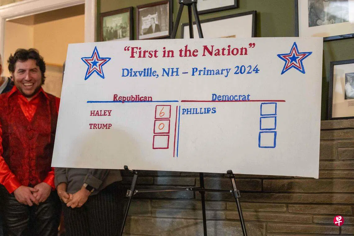 星期二(1月23日)零时(新加坡时间星期二下午1时),新罕布什尔州边境小镇迪克斯维尔山口(Dixville Notch)按照惯例率先投票,当地四名共和党注册选民和两名独立选民都把票投给黑利。