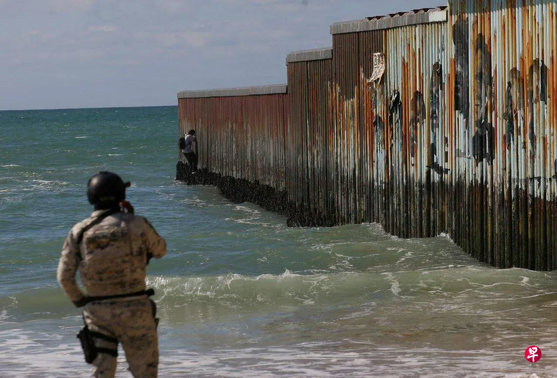 近期美国与墨西哥边境再现非法移民潮,一名男子上周三(2月14日)不顾在附近站岗的墨西哥国民警卫队队员,攀爬墨西哥一侧的边境围栏,试图进入美国。