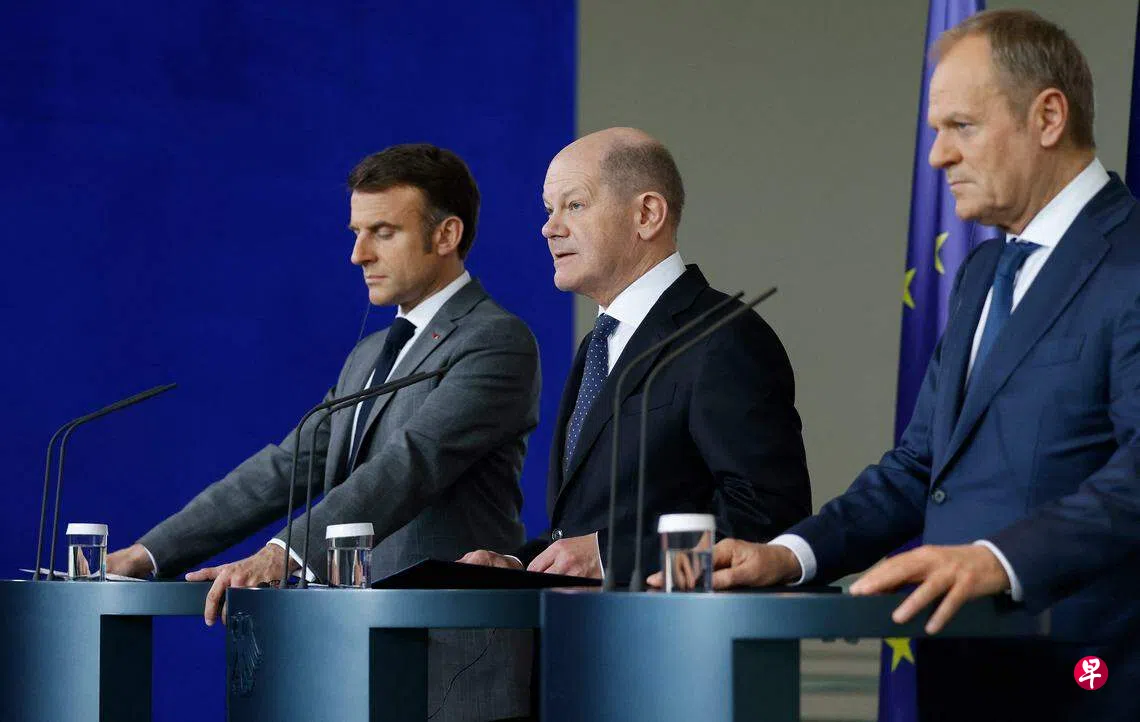 朔尔茨称,法国总统马克龙和波兰总理图斯克重申对乌克兰的支持,他们都认为必须在全球市场为乌克兰采购更多武器。