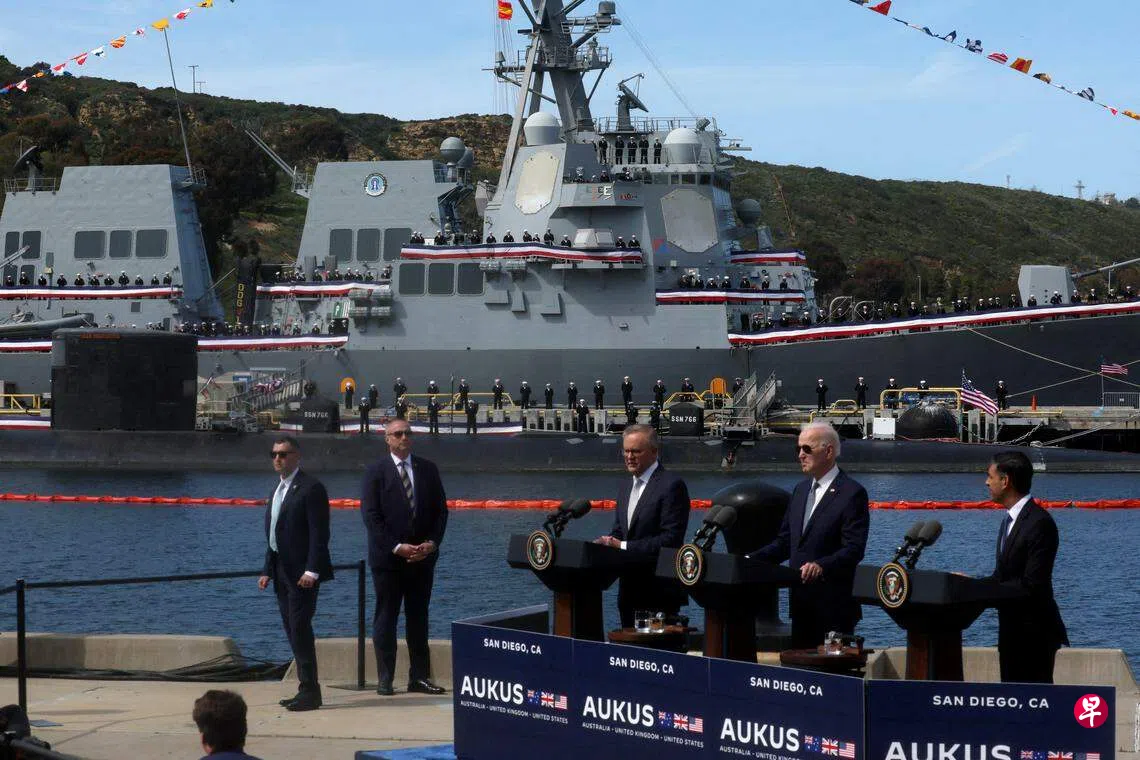 美英澳三国在2021年组成澳英美安全协议(AUKUS),目的之一是应对中国日益增强的影响力。协议设定了两大支柱,第一支柱是为澳洲提供核驱动攻击潜水艇,协助它建立一支核动潜艇舰队。