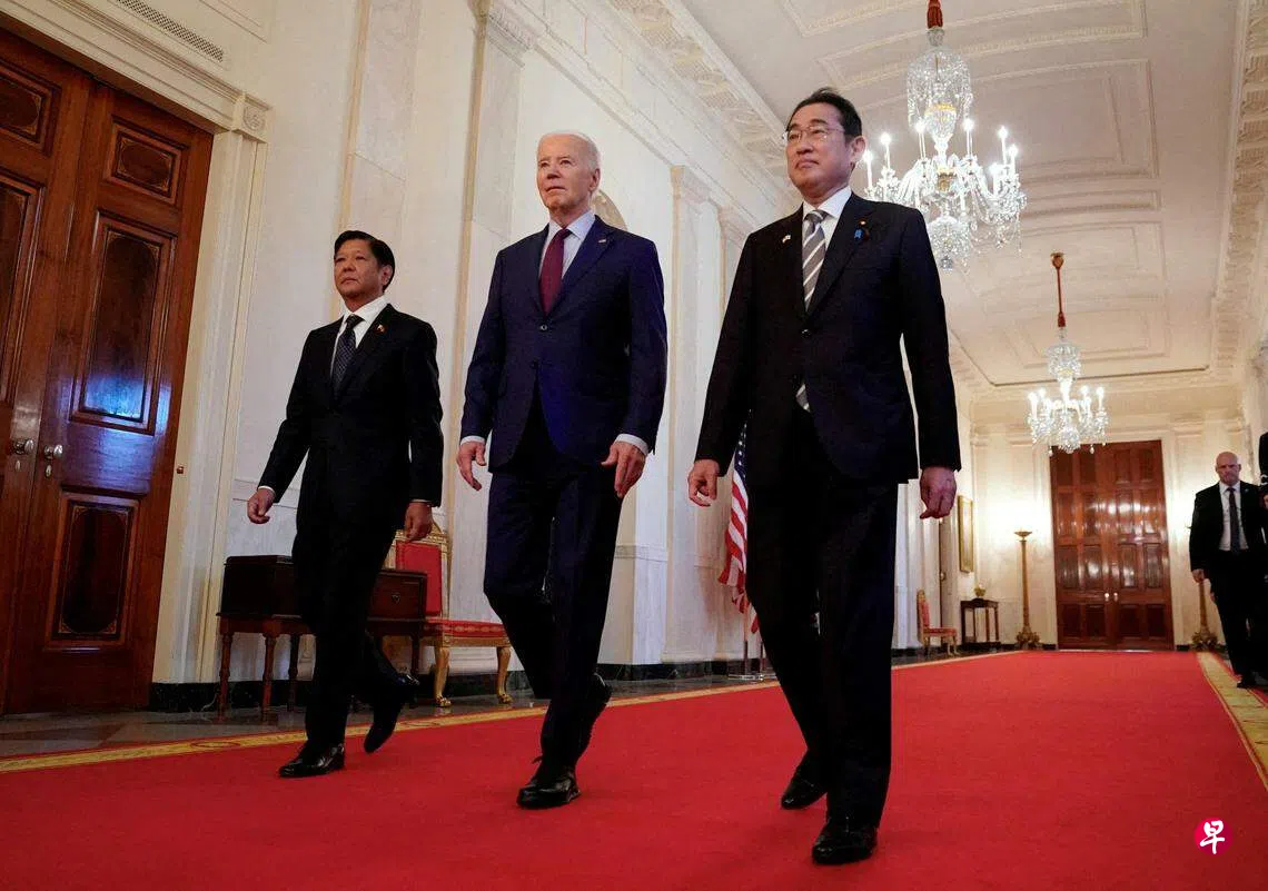 美国总统拜登、日本首相岸田文雄和菲律宾总统小马可斯星期四(4月11日)在华盛顿举行首个美日菲三国峰会。