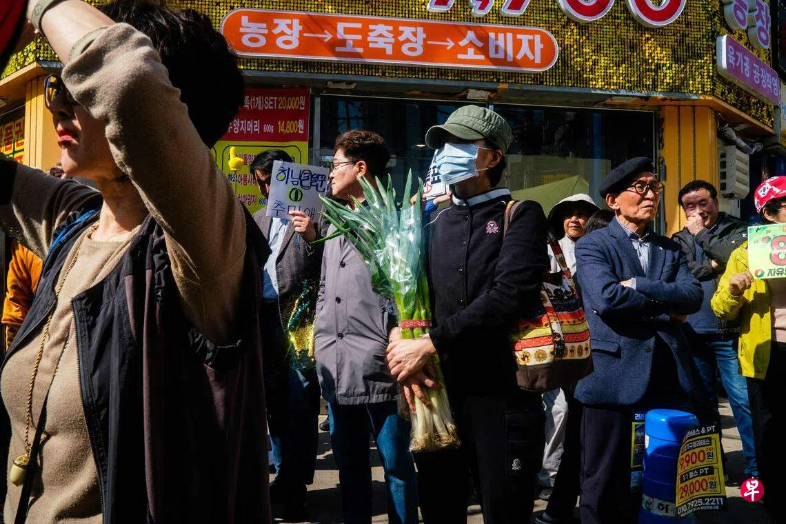 《联合早报》首尔通讯员姜贵瑛:他(尹锡悦)拿着一捆大葱,看到价格是875韩币,差不多是八、九角新币就说这个大葱的价格很合理。这一句话让很多农夫、老百姓不满,因为我们在所有地方都找不到这么便宜的大葱......所以大家都说那个总统大葱哪里找。