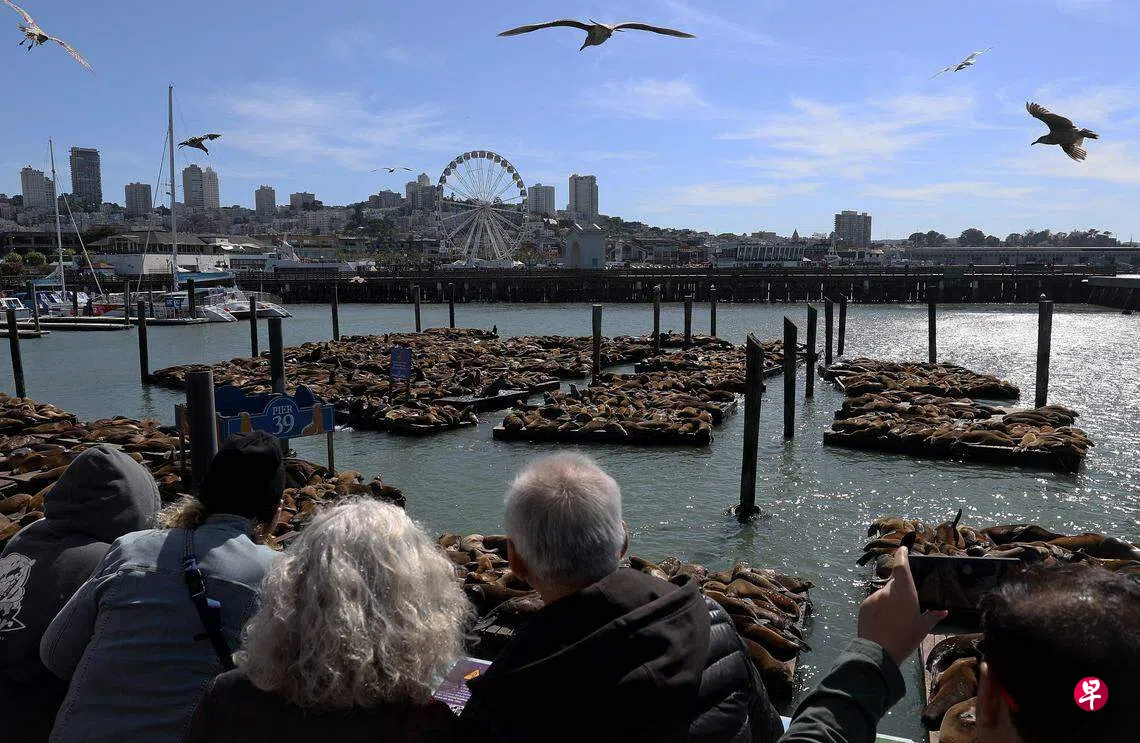 美国加利福尼亚州旧金山市渔人码头的39号码头近期聚集了1000多头海狮,数量之多创15年来新高。若在此时到此一游,不仅能看到成群海狮堆挤在木质船坞上晒太阳,还能看到它们在海中嬉戏、撕咬和嚎叫。据悉,由于春季鱼群将南迁交配,周边水域因此存在着大量鳀鱼和鲱鱼,因此吸引了大群海狮。(法新社)