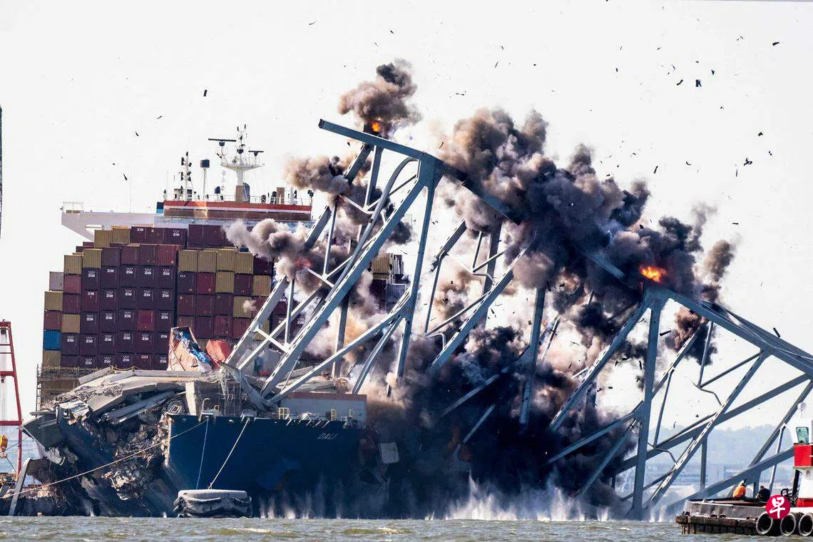 (巴尔的摩综合电)美国当局用爆破法拆除被集装箱货船撞毁的巴尔的摩桥梁的残骸,让集装箱船脱困移走,好让这条航道在本月内全面复航。