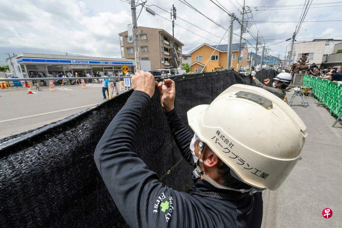 挡住可拍到日本富士山美景的屏障,终于在星期二(5月21日)完成。这个设在日本山梨县富士河口湖一家Lawson便利店正对面马路边的黑色网状屏障,高约2.5米、宽约20米,即使把手举高也无法拍到富士山。当地居民曾投诉大量游客到那里拍照,导致人行道人满为患,有的游客无视禁烟令,乱丢垃圾,随意越过公路,甚至有人爬上附近建筑的屋顶拍照。他们希望设立屏障能防止游客不遵守交通规则等危险行为。(法新社)