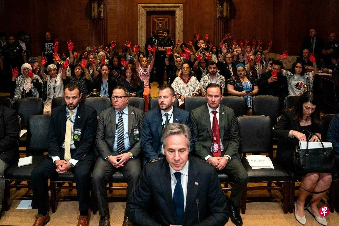 布林肯在两场听证会上发言前,遭愤怒的反战示威者打断。他们指责他是参与种族灭绝行为的“战犯”,双手沾满数万巴勒斯坦人的鲜血。抗议者被拖出会场后,听证会才得以继续。