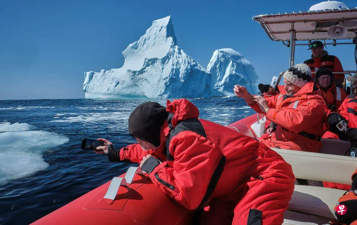加拿大纽芬兰省的圣卢奈尔-格里奎特(Saint Lunaire-Griquet)迎来冰山观赏旺季,旅客们兴高采烈地拍摄从丹麦的格陵兰岛向西南漂移至拉布拉多海的冰山碎片。据纽芬兰冰山观赏报告数字,去年3月份,约4万3000名游客参加冰山旅游团,目前则已有7万8000人报名。业者为游客带动地方救济而振奋,然而,德国阿尔弗雷德·韦格纳研究所日前发布公报说,在全球变暖影响下,格陵兰岛东北部北纬79度的冰川正在大量融化。这将导致海平面上升,对人类生存构成威胁。(路透社)